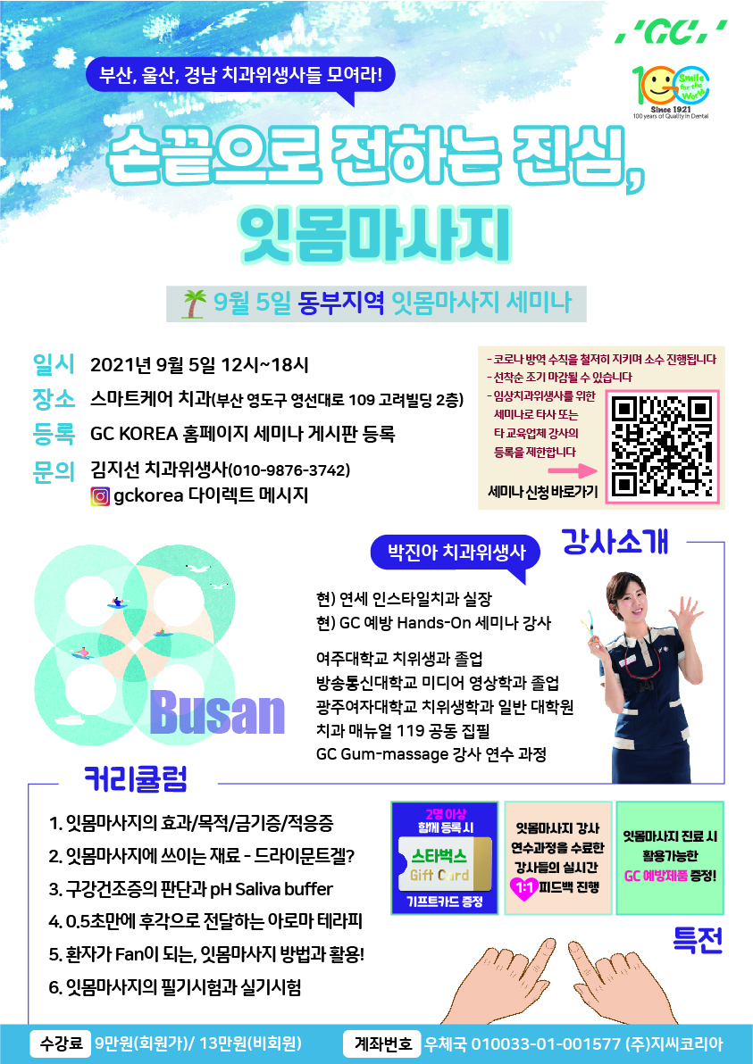 [치과위생사 세미나] [마감] (9/5 잇몸마사지 세미나_부산) 손끝으로 전하는 진심, 잇몸마사지!