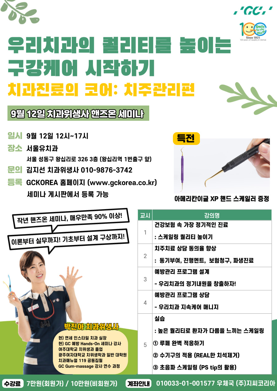 2021-09-05[치과위생사 세미나] [마감] 9/12 우리치과의 퀄리티를 높이는 구강케어 시작하기 (치과진료의 코어 : 치주관리편)